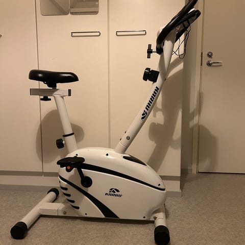 Gymstick kuntopyörä valkoisella rungolla ja mustilla kahvoilla. Varustettu digitaalisella näytöllä, joka näyttää harjoituksen tiedot. Säädettävä satula ja vastuspyörä tarjoavat erilaisia harjoitusvaihtoehtoja.