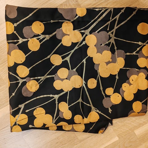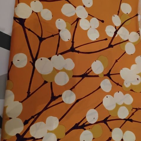 Myydään käyttämätön pala Marimekon Lumimarja - kangasta. Paksua puuvillasatiinia. Musta, jossa oransseja marjoja, jotka hehkuvat auringon paisteessa. Pituus 127cm.
