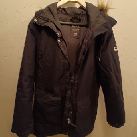 Helly Hansen talvitakki naisten, koko L, musta väri. Erittäin vähälle käytölle jäänyt. Pidempi malli, joka peittää pyllyn. Hupussa irroitettava karvareunus.