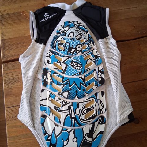 Salomon-selkäpanssarin pelkkä päällyskangasosa, juniorkoko XL. Itse panssariosa on ottanut osumaa, eikä kuulu mukaan. Verkkokangas ja tarraosat ovat täysin ehjät.