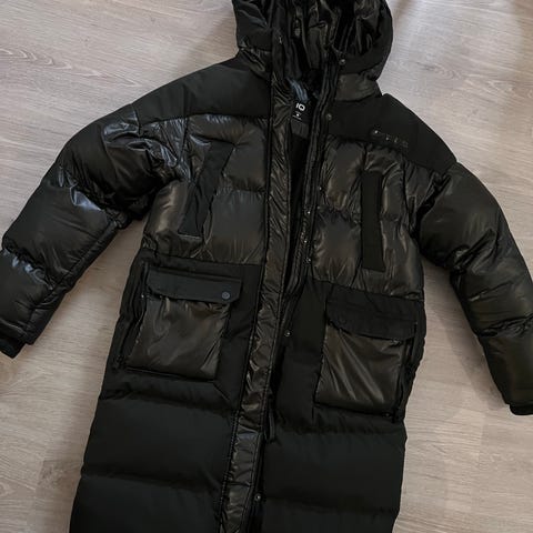 Toppatakki, paksu ja lämmin. Kauluksessa hieman meikkitahraa, muuten siisti ja ehjä. Isot taskut eessä ja sivuilla toiset. Alhaalla ja hupussa kiristykset.
