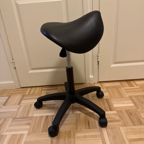 Hyväkuntoinen satulatuoli. Tukeva ja pyörät alla. Korkeus säätö kaasujousella