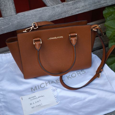Michael Korsin Selma (medium) on kuin uusi. Laukussa ei ole mitään käytön- tai kulumisenjälkiä. Laukku on aitoa saffiano-nahkaa. Mitat ovat 23*17*10 cm. Laukku on ostettu Helsingin keskustan Stockmannilta.