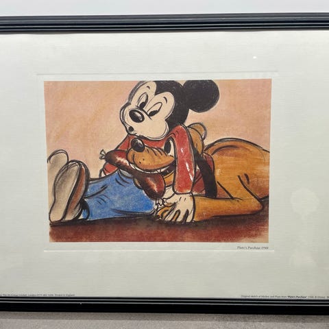 Walt Disney Mickey Mouse ja Pluto taidejuliste, mustavalkoinen piirroskuva, kehystetty siniharmaalla puisella kehyksellä. Vain nouto Etelä-Sipoosta.