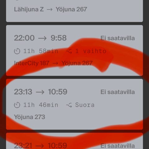 VR IC 34 juna liikennöi reittiä Rovaniemi - Tikkurila (Vantaa). Lähtöaika Rovaniemi 13:02, saapumisaika Tikkurila 21:22. Vaunu 1, yläkerta, paikka 76, käytävä. Matkustaja on eläkeläinen. Lisäpalvelut eivät ole käytössä.