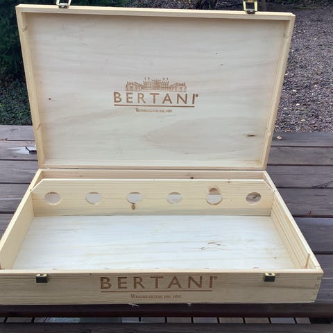 Viinilaatikko on valmistettu puusta ja siinä on kaiverrukset brändin nimellä. Soveltuu säilytykseen tai koristekäyttöön.