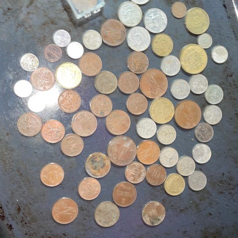 Puinen koristekulho ja en tiedä vaikka olis puhdetyö sodanaikojen ja kolikot ja kulho painaa yhteensä 1800 grammaa. On suomalaisii ja ulkomaalaisii kolikoita.en oo katsonut arvoja .sen verran oon kattonu et ei kultakolikoita oo.