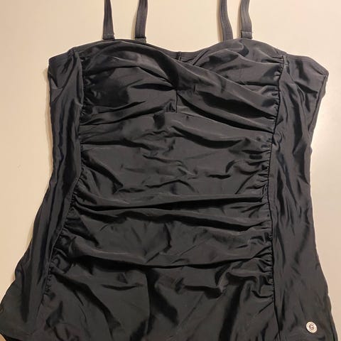 Tässä tarjolla Finwearin uimapuku, sävyltään punavalkoinen. Koko on L/40. Vaatteessa on rintojen välissä röyhelö, muuten uimapuku on hyvin tavanomainen. Sisävuori on valkoinen, rinnoissa on kevyet toppaukset. Sairauden vuoksi laihduin äkisti, ehdin käyttää pukua vain pari vuotta.