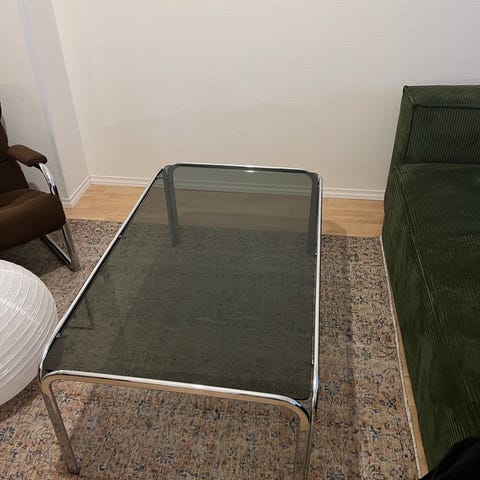 Ajaton lasinen, kirkas sohvapöytä, joka sopii moneen kotiin. Sohvapöytä on hyvässä kunnossa, näkyy vain pieniä käytön jälkiä.