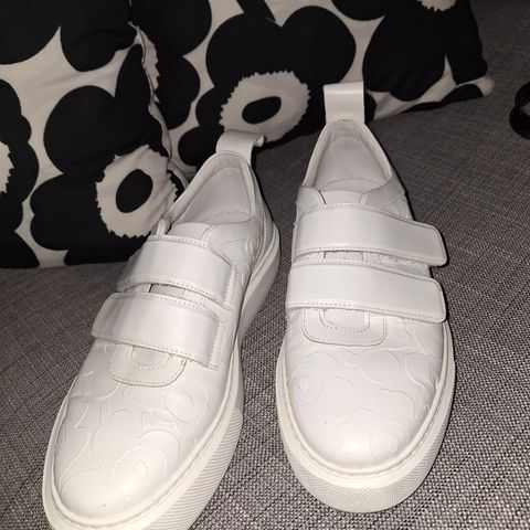 Marimekko Niittyheinikossa Mini Unikko tennarit. Nauhallisissa kengissä on 4 cm paksu kumipohja, josta 40% on kierrätettyä kumia. Päällinen puuvillamarkiisia.