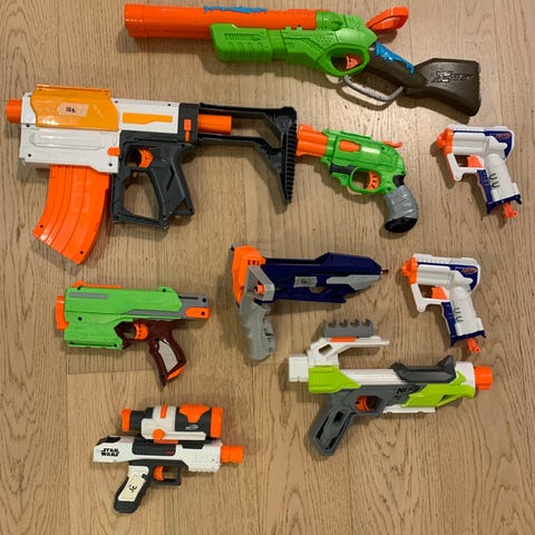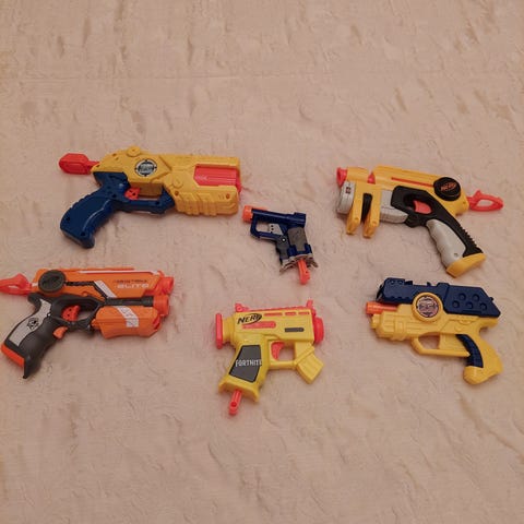Nerf pyssyt ja kasa panoksia. Ostettu minulle joskus lapsena ja enää ei ole ollut käyttöä moneen vuoteen. Ihan ok kunnossa.