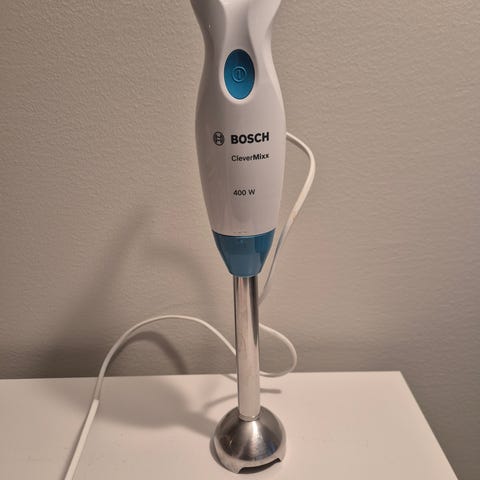 Hyvässä käytetyssä kunnossa oleva johdoton, ladattava, sauvasekoitin. Merkki Bosch mixxo. Muuntaja muuttanut väriään kellertäväksi. Samoin itse laite on paikoitellen muuttunut valkoisesta kerman väriseksi. Ei vaikuta käyttöön.