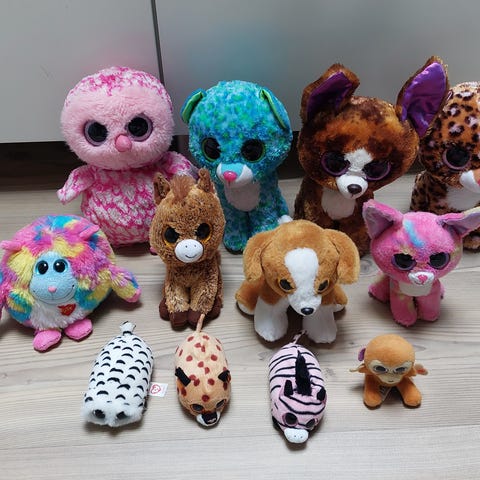 Ty-lelut 12kpl. Hyvä kuntoisia. Isoimpien korkeus n. 24cm, keskimmäisten korkeus n. 16cm. Kaikki Ty-lelut yhteensä 40e tai isot 7e/kpl, keskikokoiset 5e/kpl ja pienet 3e/kpl. Nouto tai 5e ja suuremmat ostokset voin postittaa. Halutessasi samaan toridiili- / postipakettiin voi kerätä useamman tuotteen ja maksaa ne kerralla, niin tulevat kaikki samassa paketissa. Laita viestiä torin kautta, jos haluat ostaa samaan pakettiin muuta.