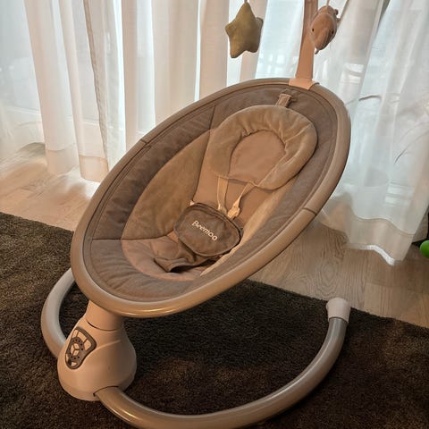 Beemoo Rocker sitteri. 5 keinumisnopeutta ja ajastintoiminto. Käännettävissä 360 astetta ja selkänojan saa kahteen asentoon. 16 eri melodiaa ja 5 luontoääntä. Liiketunnistusominaisuus.