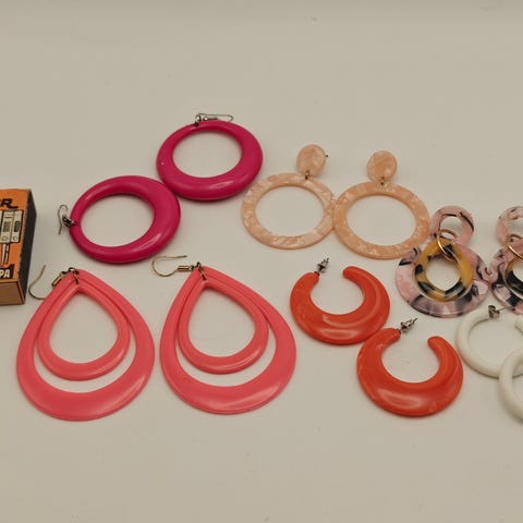 Myyntiin 5 paria retro korviksia. Siniset ja keltaiset rinkulat metallia, keltainen kolmio muovia ja isot lasihelmiä. Hinta setille 5€ löytyy Salosta MMM