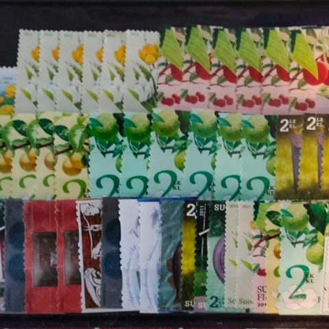 Käytetyt tai cto leimatut . Koko erä 40 euroa. Sarjoina alkaen 1 euro/sarja , yksittäiset alkaen 0,10 euroa/kpl. Pk lisätään tarvittaessa postin takasan mukaan . Pakattuna perg. pusseihin ja muovitaskuun,