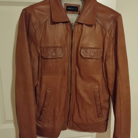 Miesten ruskea nahkatakki, ainakin 30 vuotta vanha. Paksua nahkaa, painaakin jonkin verran. Harmaa on kaulus irrotettava. Kangasvuori on jo kulunut, muuten päällisin puolin täysin ehjä.