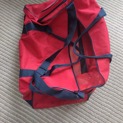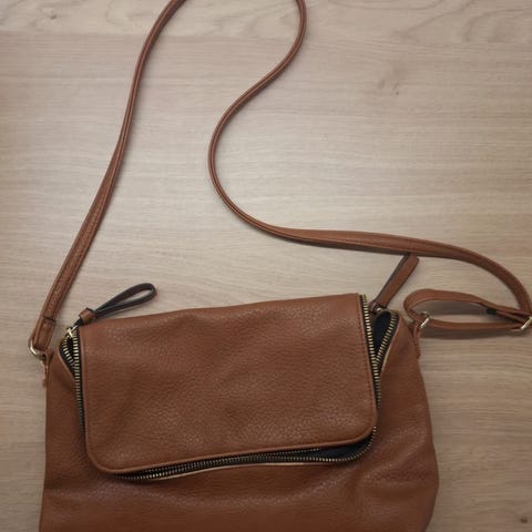Laukun tekonahka on paikoin kulunut, mutta laukku on ehjä ja vetoketjut toimivat.