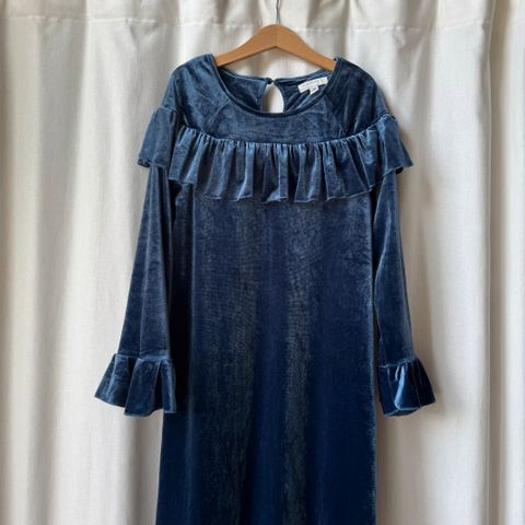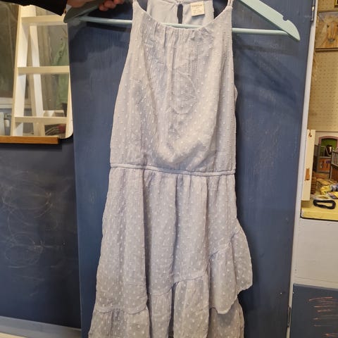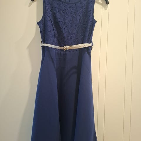 Hyväkuntoinen, sininen mekko, pitsiyläosalla.