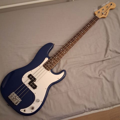 Myydän Squierin Bronco Bass -basso. Soitin on lyhytskaalainen (27") joten se on mahtava ketterän ja hauskan musiikin soittoon.