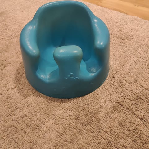Paljon käytetty ja osittain jo värjääntyny Bumbo-istuin. Edelleen käyttökelpoinen ja vyöt toimii moitteettomasti.