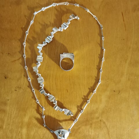 Myydään kuvien mukainen hopea korusetti:kaulakoru+rannekoru. Uudenveroisessa kunnossa (ei ollut käytössä)