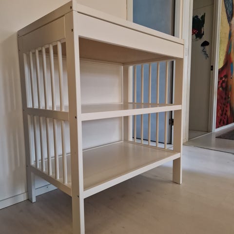 Myydään IKEA Gulliver lastenhoitopöytä. Mukaan hoitoalusta. Hoitoalusta hylkii kosteutta ja on helppo pyyhkiä puhtaaksi kostealla rätillä.