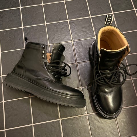 Tässä oivat sneaky Steven bootsit ja nää on erinomaisessa kunnossa. Puhdistan tietenkin pölystä ja muusta ja suihkutan päälle vielä semmoista joka auttaa pitää veden pois kengistä.
