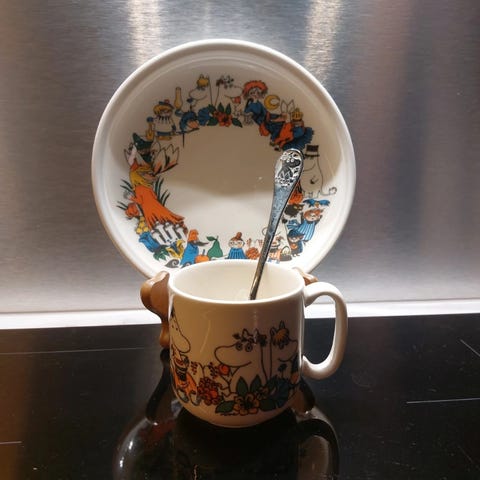 Arabia Muumi ( Pikkumyy versio astiasto). joka sisältää lautane sekä muki. Astiastossa on Muumi-aiheiset kuvitukset, Materiaalina posliini . Ja Ovat Käyttämättömiä.