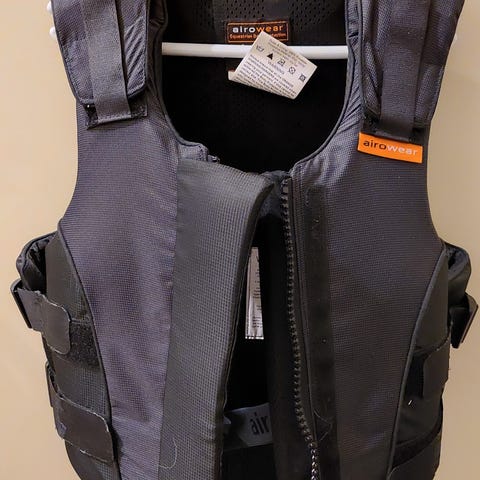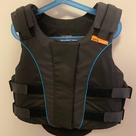 Kerran käytetty Airowearin ratsastusturvaliivi koossa T1 eli 13–15 vuotiaan koko. Selkäosan pituus Regular eli normaali.