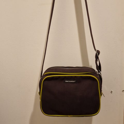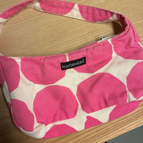 Marimekko kangas olkalaukku unisex. Laukku on valmistettu kankaasta ja siinä on musta pohjaväri valkoisilla ympyräkuvioilla. Sopii käytettäväksi eri tilanteissa ja molemmille sukupuolille.