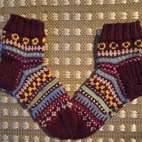 Itse tehdyt pitkät kirjoneulesukat koossa 39-40. Väri luonnonvalkoinen, harmaa ja sininen.