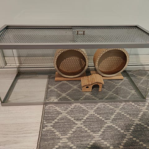 Mukaan myös kuljetuskoppa, sisutustarvikkeita, chinchillahiekkaa ja puruja.