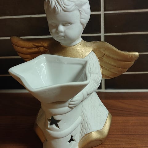 Kimallekoristeinen enkelikynttilä. Korkeus n. 11 cm ja leveys n. 10,5 cm.