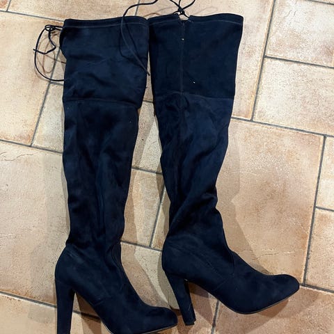 Kerran käytetyt polvisaappaat. Ei vetoketjua, vain nyörit varren yläosassa.
