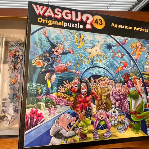 Jumbo Wasgij Destiny Puzzle, jossa on 1000 palasta. Palapelin teema on Fast Food Frenzy. Kaikki palat tallella ja pussitettu
