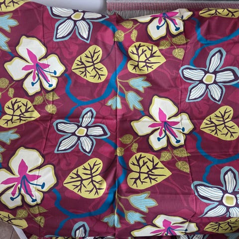 Kauniin tummanpunaiset ohuet puuvillakankaasta ommellut pitkät verhot (2 kpl). Ylhäällä 5cm tankokuja ja 5 cm harja (käy siis myös tankoon), mutta ripustus onnistuu myös nipsuilla. Alhaalla 10 cm päärme, josta saa tarvittaessa vähän lisää pituutta verhoille.