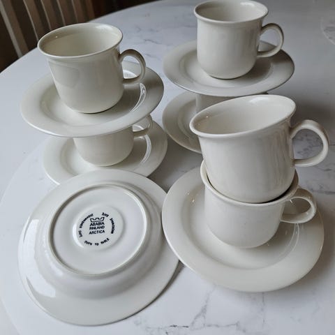 Kuin uusi 10 kpl kahvikuppeja, sokerikko, kermakko ja kahvikannu. 2 ylimääräistä lautasta mukana