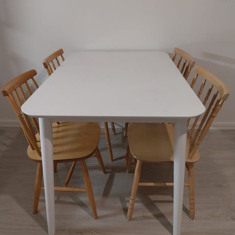 Annetaan puinen ruokapöytä ja siihen kuuluvat puiset tuolit. Pöydän kansi on valkoinen ja tuolien istuinosa on puunvärinen. Kalusteet soveltuvat ruokailuun ja arkipäivän käyttöön. Pöytä on uudelleen maalattu valkoiseksi ja tasossa on käytön jälkiä. Helppo maalata uudelleen tai päällystää dcfixillä. Nopein hakija saa en ala varaileen jos ei ennakkoon maksa. Jatkopalalla saa helposti 8 hengen pöydäksi tarvittaessa.