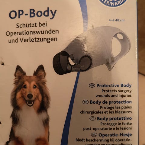MPS merkkinen toipilaspuku, esim leikkauksen jälkeiselle ajalle. Korvaa kaulurin käyttöä ja estää haavan nuolemista. Koko cat S, mutta ollut meillä 5,5kg tipsulla käytössä. Vastaa koirien 25-30cm kokoa. Ovh. 40e.