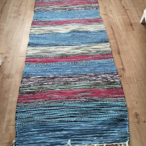 Sinivalkosävyinen siisti puuvillamatto. Pituus 209, leveys 76.