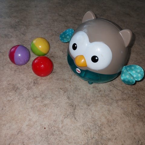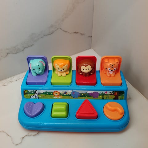 Vauvan aktiviteettilelu, jossa eläinhahmot pomppaavat eri toiminnoista. Hyvin toimii. Tarroissa vähän kulumaa yläreunoista.