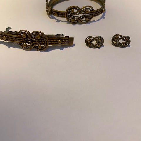 Sarpaneva Kelo-setti: Riipus ketjulla, rannekoru ja sormus. Ametisteilla. Pronssikoru vintage.