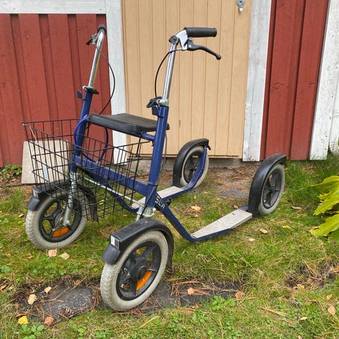 Esla potkupyörä, sininen. Kulkeutuu Pori-Forssa akselilla