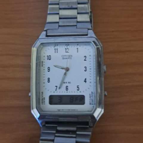 Myynnissä todellinen kellomaailman klassikko Citizen Ana-Digi. Paristo on vaihdettava, kello toimi täysin ennen pariston loppumista. Pariston vuoksi kuntoluokitus kohtalainen. Iänmukaisia lieviä hiusnaarmuja löytyy metallipinnoista. Pelkkä kello, koteloa minulla ei ole. Huom:
