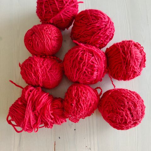 Erilaisia lankoja käsitöihin. Osa on kertaalleen neulottuja. Osa ihan uusia keriä.