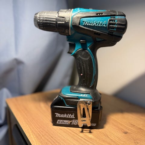Makitan 18V akuilla toimiva porakone DDF484. Mukaan käytetty 5Ah akku +30e ja pikalaturi +20e.