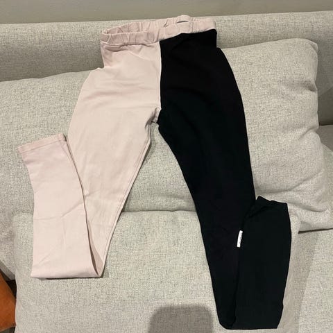 Gugguu kaksiväriset legginsit kokoa 146, mutta naftia kokoa ja vastaa pienempää. Toisen lahkeen etupuolella on yksi pieni tahra, mutta siistit legginsit muuten.