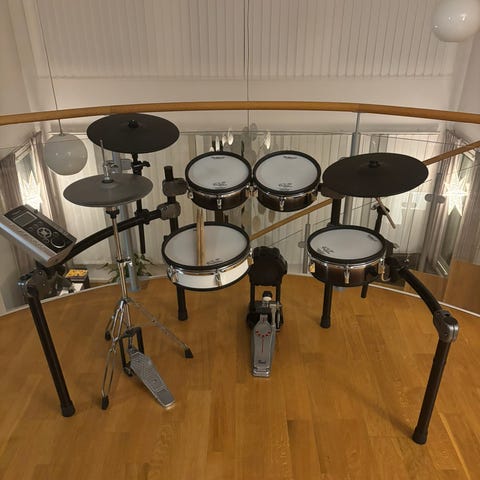 Myydään tyylikäs ajatuksella rakennettu Roland sähkösetti. Sopii kaikenlaiseen käyttöön, kotikäyttöön ja keikoille. Kaikki pädit puurunkoisia joka tekee setistä näyttävän. Täysin valmis setti soittoon.