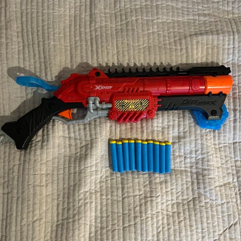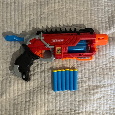 Hyväkuntoinen ja toimiva X-Shot–pyssy, mukaan 8 ammusta.